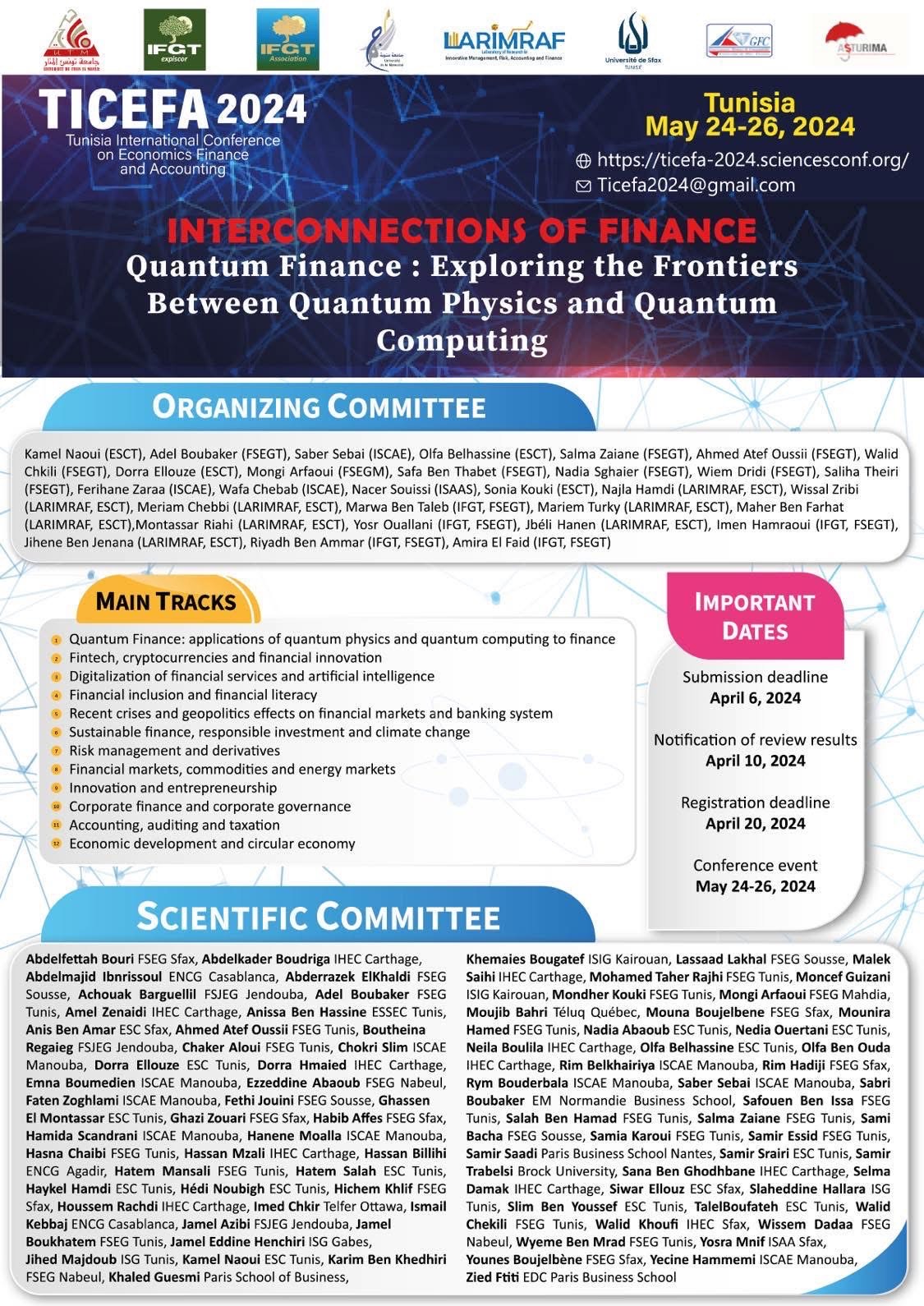 Les laboratoires LARIMRAF de l’université de la Manouba, IFGT de l’université de Tunis El Manar et GFC de l’université de Sfax ont organisé la conférence internationale en Économie Finance et Comptabilité “Tunisian International Conference on Economics, Finance and Accounting” TICEFA 2024 portant sur “The Interconnections of Finance – Quantum Finance : Exploring the Frontiers between Quantum Physics and Quantum Computing” à Hammamet, et ce du 24 au 26 Mai 2024.