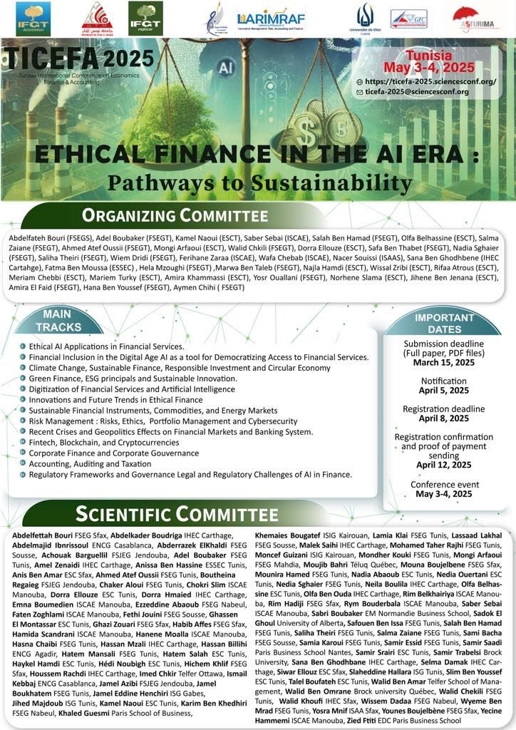 Les laboratoires LARIMRAF de l’université de la Manouba, IFGT de l’université de Tunis El Manar et GFC de l’université de Sfax ont organisé la conférence internationale en Économie Finance et Comptabilité “Tunisian International Conference on Economics, Finance and Accounting” TICEFA 2025 portant sur “Ethical Finance in the AI Era: Pathways to Sustainability” à Hammamet, et ce du 3 au 4 Mai 2025.