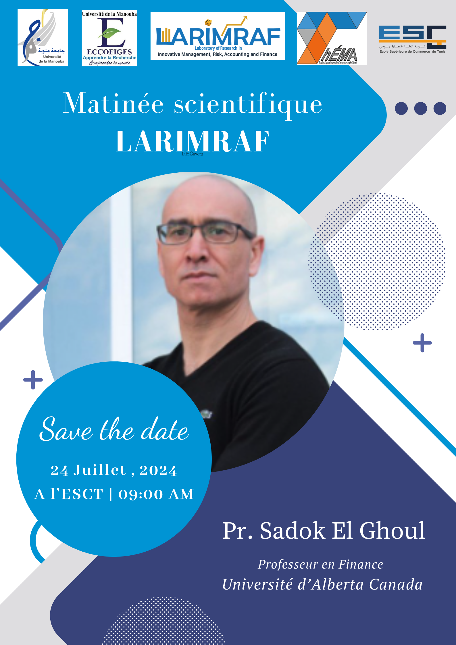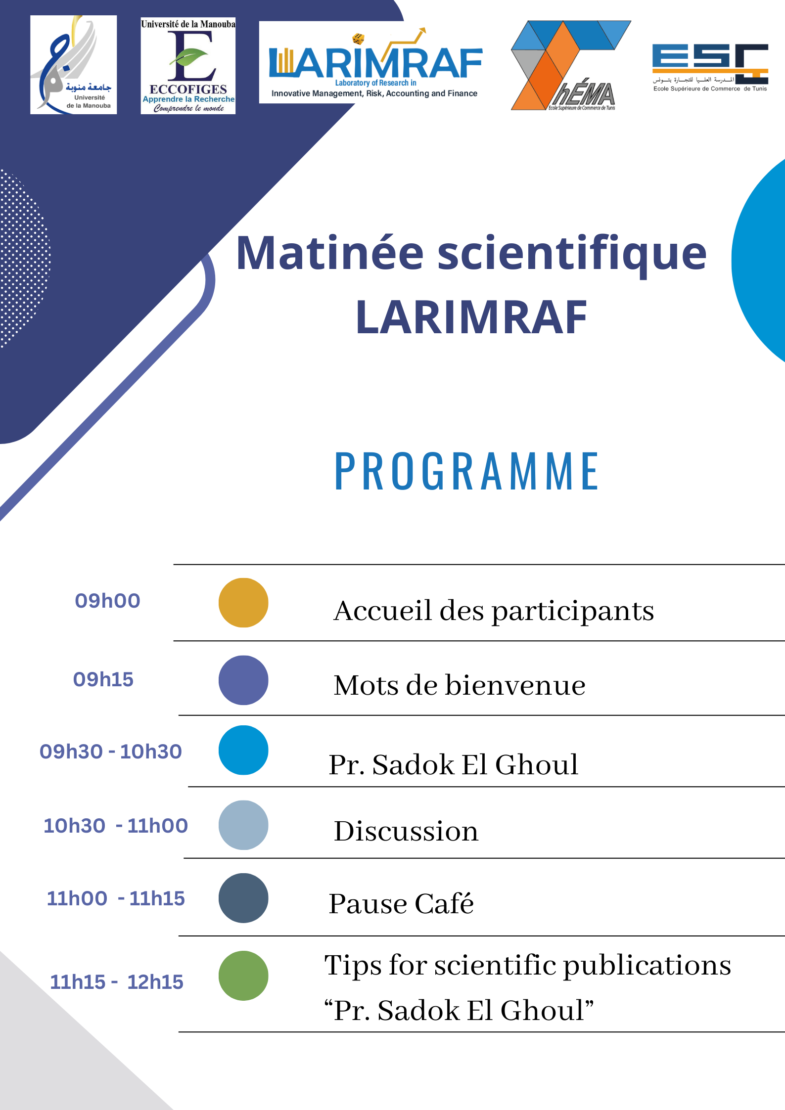 Le laboratoire de recherche LARIMRAF a organisé en collaboration avec le laboratoire de recherche Théma le 24 Juillet 2024, une matinée scientifique animée par Prof. Sadok El Ghoul portant sur les astuces en recherche scientifique pour une publication impactante, et ce au sein du laboratoire sis au centre de recherche Mohamed Imen Gallali de l’ESCT. Une discussion des travaux de Imen Jebali, Manel Chaabani et Samar Bdira, a également enrichi l’échange au cours de cette matinée.