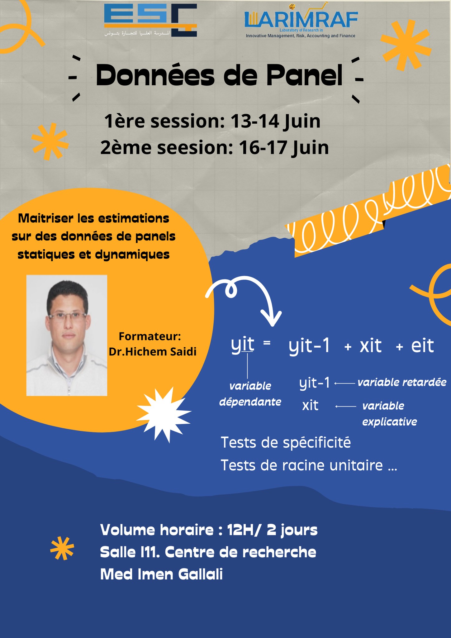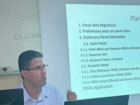 Dans le cadre de son cycle d’amélioration des compétences des membres du LARIMRAF, le laboratoire a organisé le 13-14 et le 16-17 Juin 2023, deux sessions de formation en économétrie animées par M. Hichem Saidi, portant sur le thème « Économétrie de données de panels stationnaires et non stationnaires » au local du laboratoire sis au centre de recherche Mohamed Imen Gallali de l’ESCT.