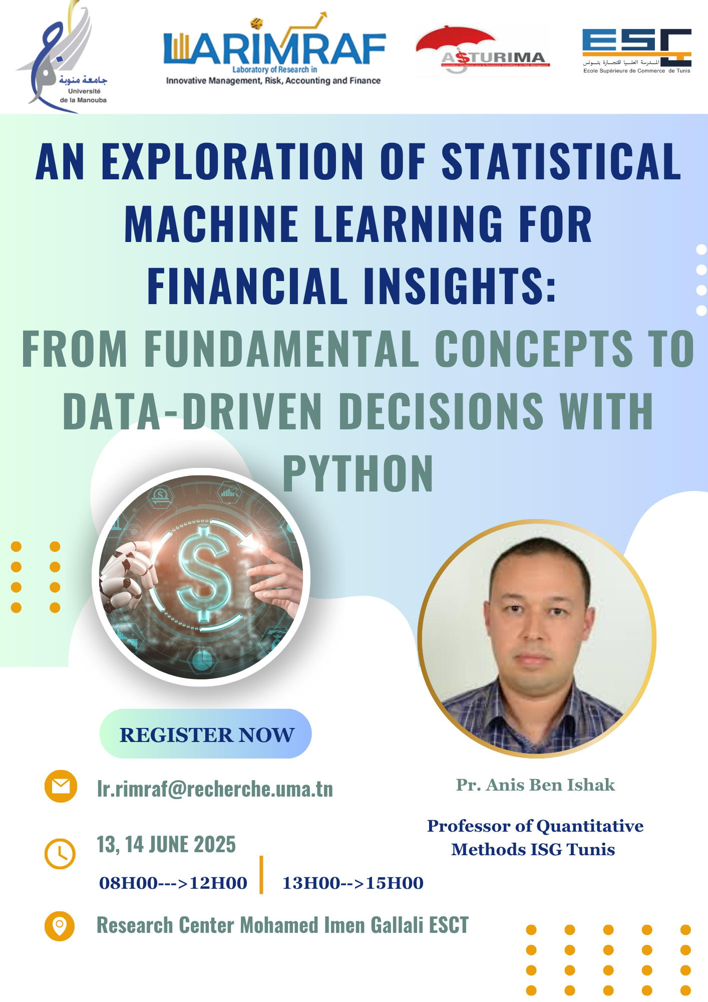 Dans le cadre de notre démarche continue de renforcement des compétences des membres du LARIMRAF, une formation intitulée « An Exploration of Statistical Machine Learning for Financial Insights: From Fundamental Concepts to Data-Driven Decisions with Python » s’est tenue les 13 et 14 juin 2025 au sein du laboratoire, situé dans le bloc de recherche Mohamed Imen Gallali de l’ESCT.