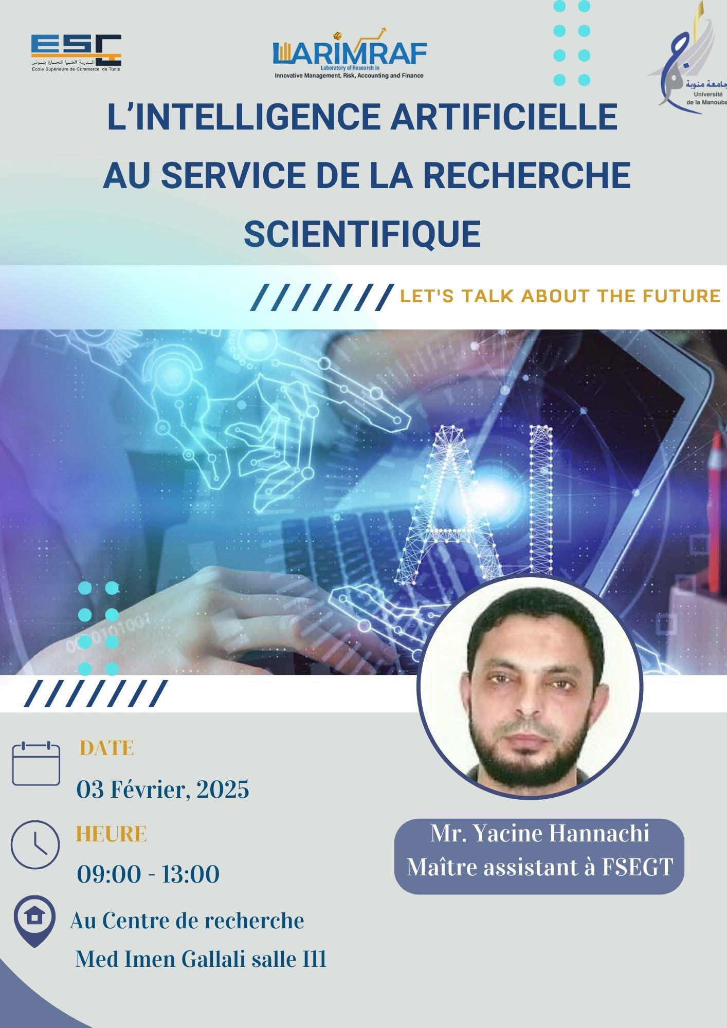 Dans le cadre du cycle d’amélioration des compétences des membres du LARIMRAF, le laboratoire a organisé le 03 Février 2025 un Workshop sur l’intelligence artificielle intitulé « L’intelligence artificielle au service de la recherche scientifique » au sein du laboratoire sis au centre de recherche Mohamed Imen Gallali de l’ESCT.